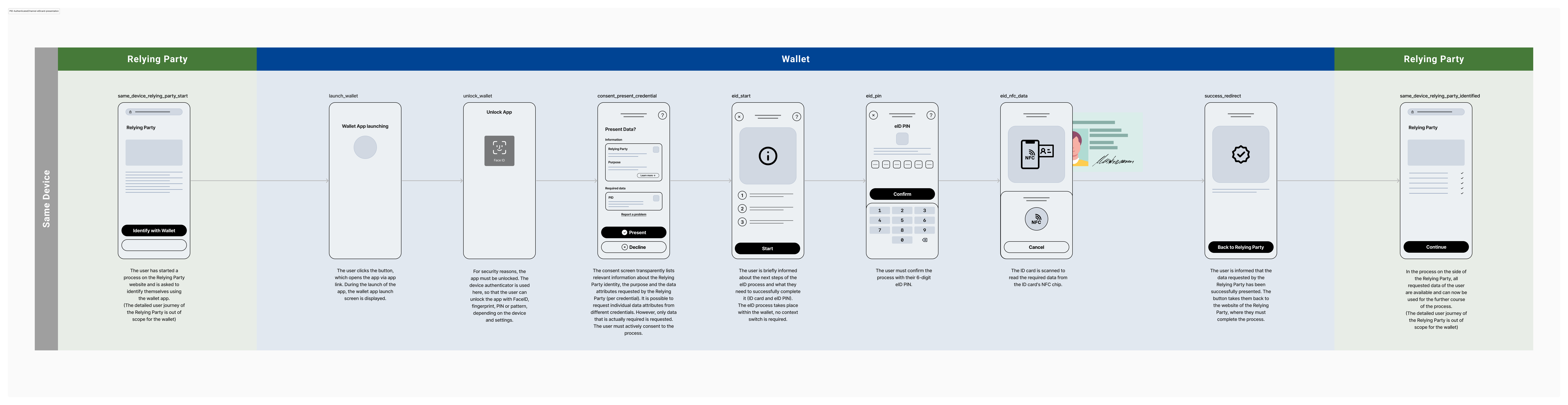 - It must be clarified whether the wallet app needs to be unlocked in this flow, as no sensitive data is displayed and the user must identify themselves with their ID card and eID PIN in order to successfully complete the process
